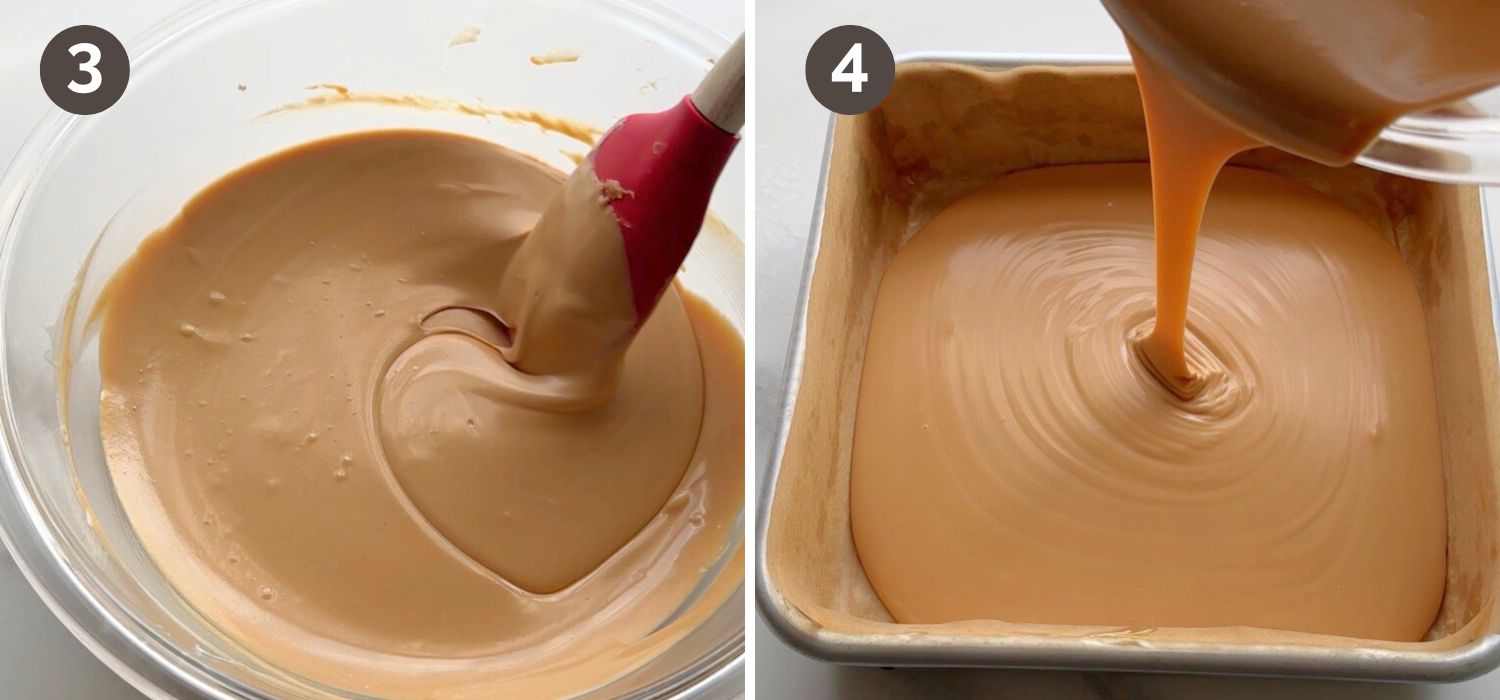 - Pour the mixture into your lined 20 cm (8-inch) square pan. Shake or tap the pan gently to level. Refrigerate until firm (about 1 hour)