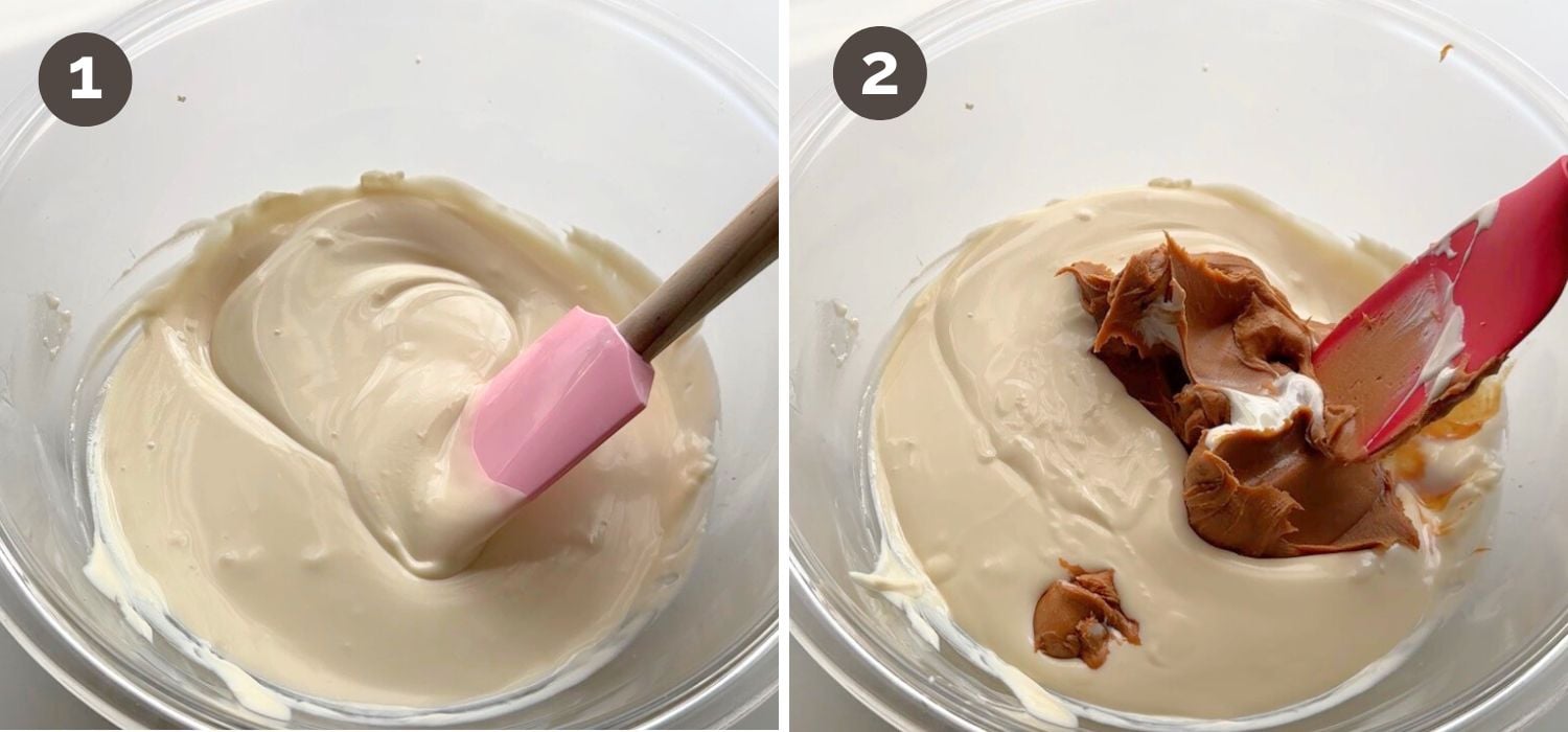 - Whisk or stir until everything is fully combined, with no streaks of white chocolate or Biscoff cookie spread. The mixture should be thick, smooth, and creamy, but still pourable.