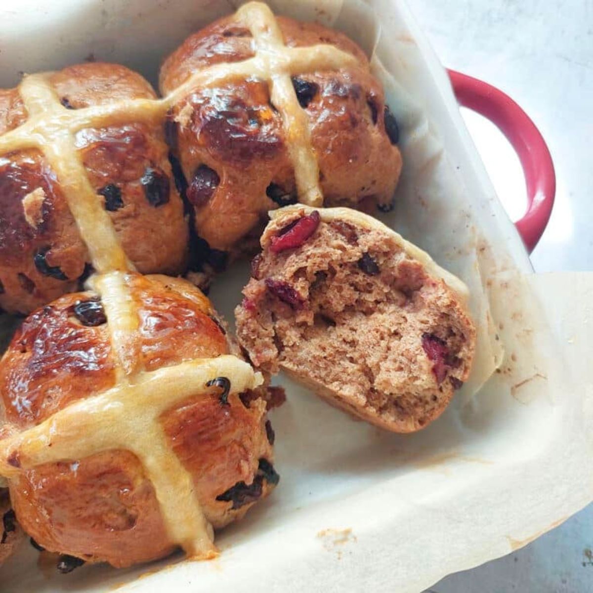 - Spoon the paste into a piping bag and snip the corner. Pipe crosses over each bun.