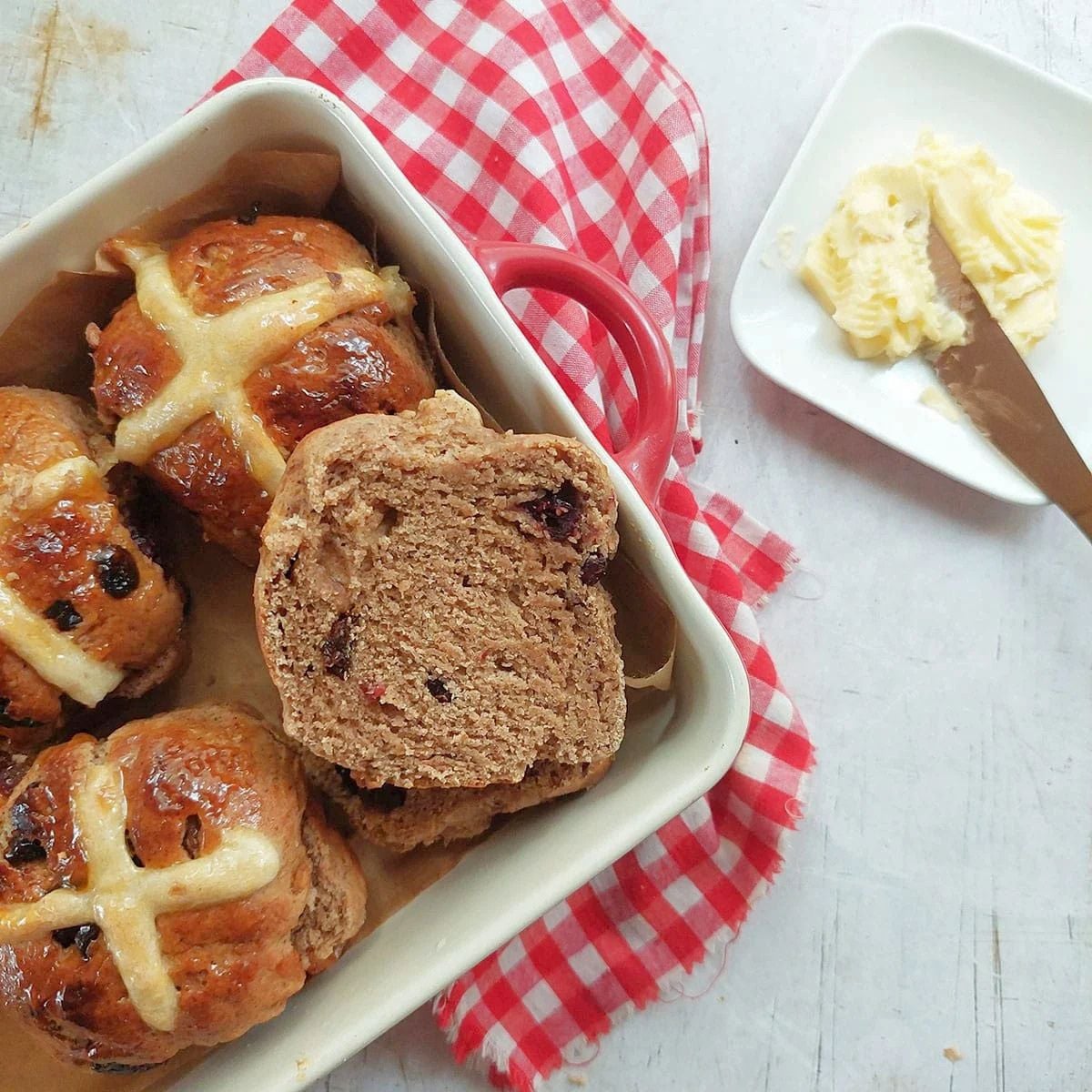 Soft, lightly spiced hot cross buns made without yeast. No kneading, quick and easy, while still keeping that classic flavor and texture.